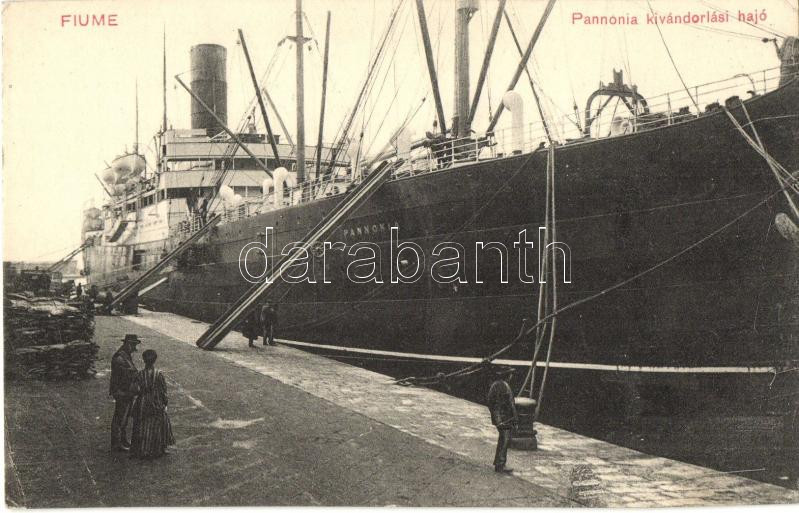 Fiume, kikötő, Pannónia kivándorlási hajó / Port, emigration ship (EK) https://www.darabanth.com/de/287-Fernauktion/287.0/Ansichtskarten/Schiffe~200055/Fiume-kikoto-Pannonia-kivandorlasi-hajo-Port-emigration-ship-EK~II1510176