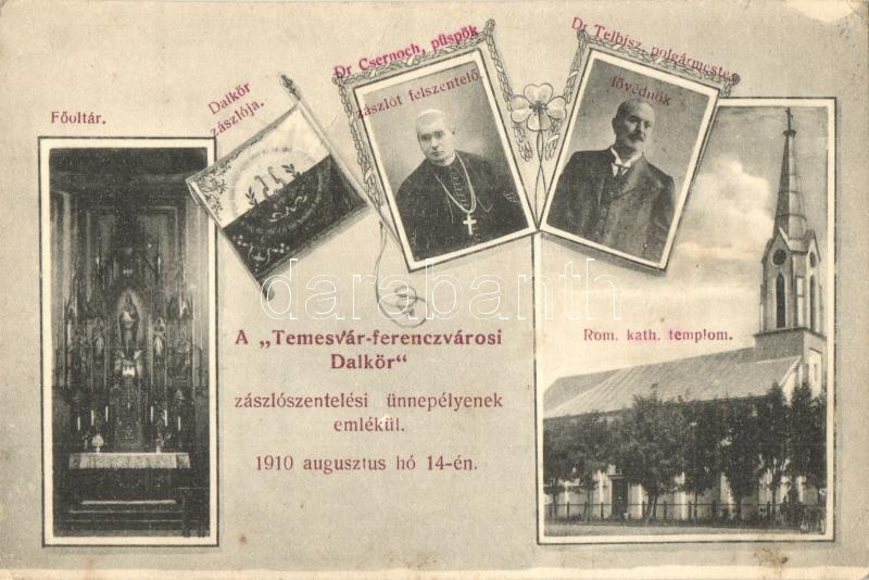Temesvár, Timisoara; Ferenczvárosi Dalkör, Római katolikus templom és főoltára, belső, Dr. Csernoch püspök és Dr. Telbisz polgármester / Roman Catholic church, interior, choir flag inauguration, bishop, mayor, floral (fa)