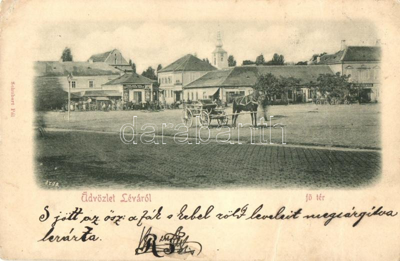 1899 Léva, Levice; Fő tér, Czirok János utóda Amstetter Imre üzlete, piac, gyógyszertár, Schubert Pál üzlete és saját kiadása / main square, market, pharmacy, shops (fa)