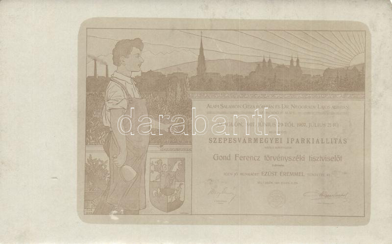 Beschreibung: 1907 Igló, Iglau, Spisská Nová Ves; Szepesvármegyei Iparkiállítás kitüntetése Gond Ferencz törvényszéki tisztviselőnek / Industry Exhibition Award certificate s: Wottitz (EM)