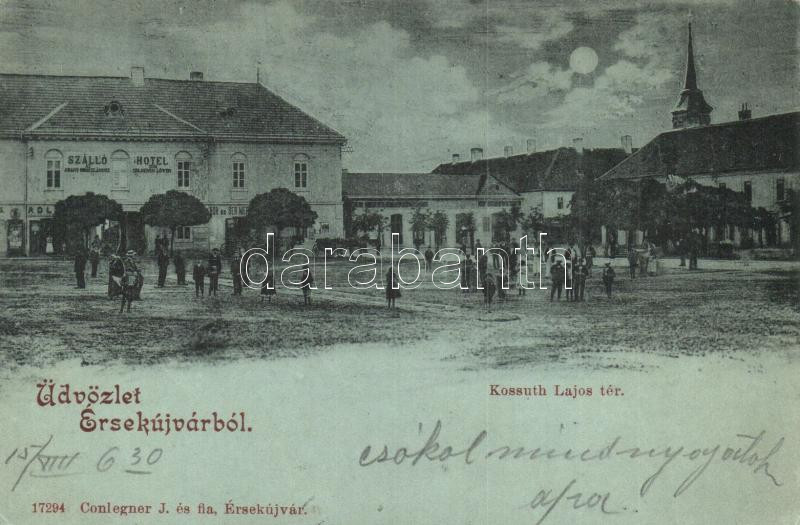 Beschreibung: Érsekújvár, Nové Zamky; Kossuth Lajos tér, Szálló az Arany Oroszlánhoz, Conlegner J. és fia kiadása / square, hotel (EK)