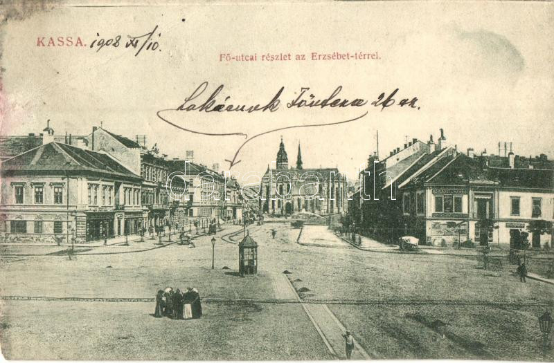 Beschreibung: Kassa, Kosice; Fő utca, Erzsébet tér, Adrianyi és Marko üzlete, kiadja Divald Károly fia / main street, square, shop (EB)