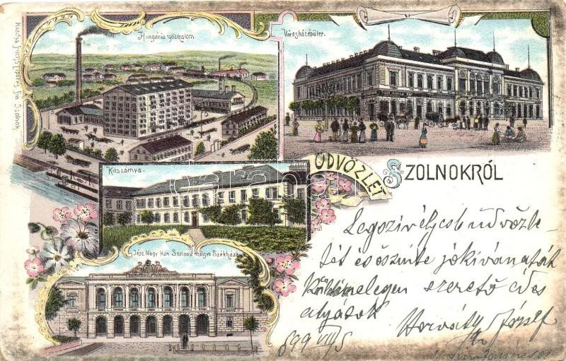 1899 Szolnok, Hungária gőzmalom, Városház, Kaszárnya, Megyeszékház, Fu... https://www.darabanth.com/de/287-Fernauktion/287.0/Ansichtskarten/Ungarn~200005/1899-Szolnok-Hungaria-gozmalom-Varoshaz-Kaszarnya-Megyeszekhaz-Fuchs-Lipot-floral-litho~II1509464