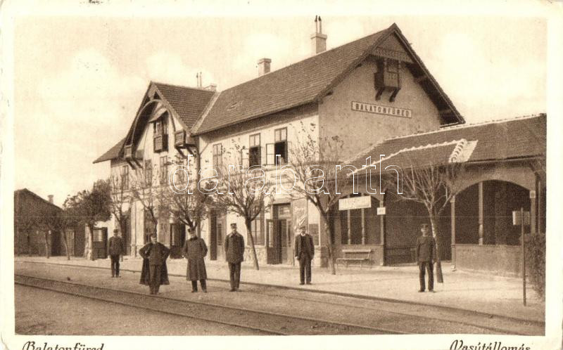 Beschreibung: Balatonfüred, Vasútállomás, vasutasok, üzlet, Dreher Maul plakát (EK)