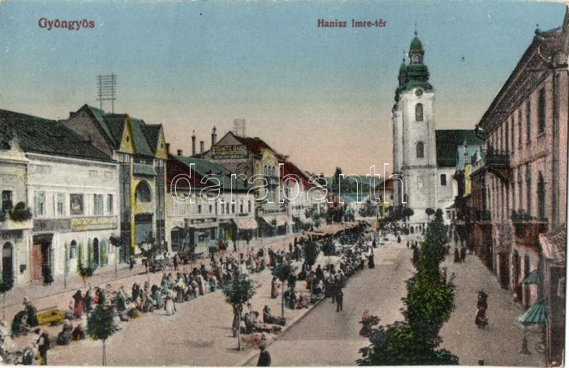 Beschreibung: Gyöngyös, Hanisz Imre tér, Deutsch Salamon és Fia Rt., üzletek, templom, piac, Steinitz Gábor papírkereskedése és saját kiadása (EK)