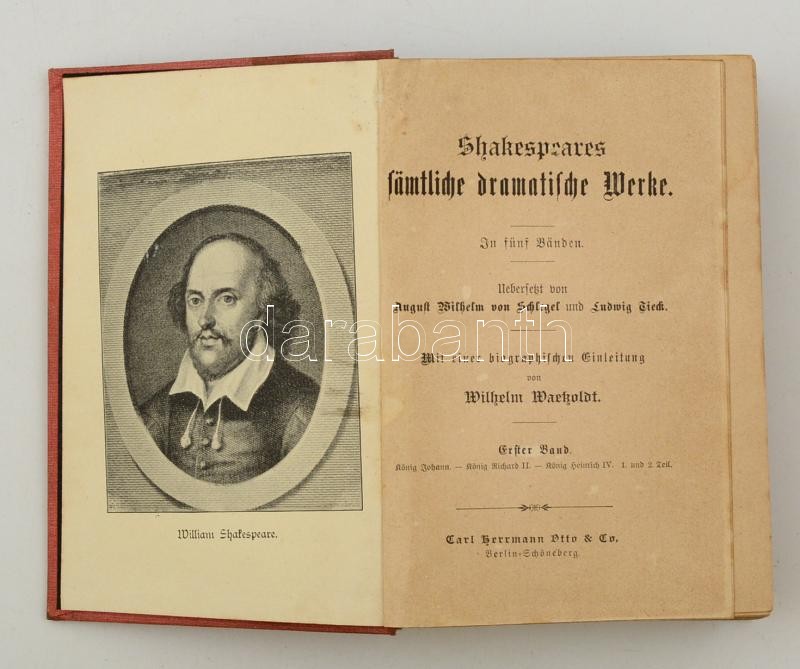 Shakespeares Sämtliche Dramatische Werke 1-9. (Három kötetben.) Berlin, é.n., Carl Hermann Otto & Co. Kiadói illusztrált aranyozott szecessziós egészvászon-kötés.