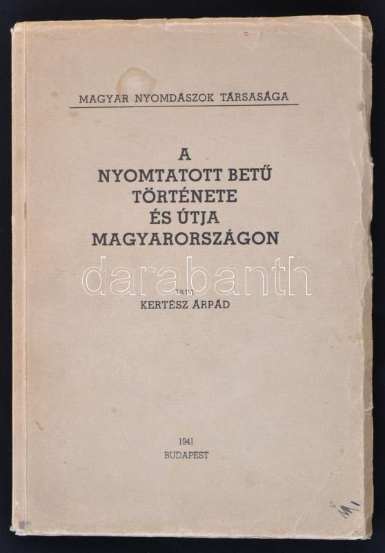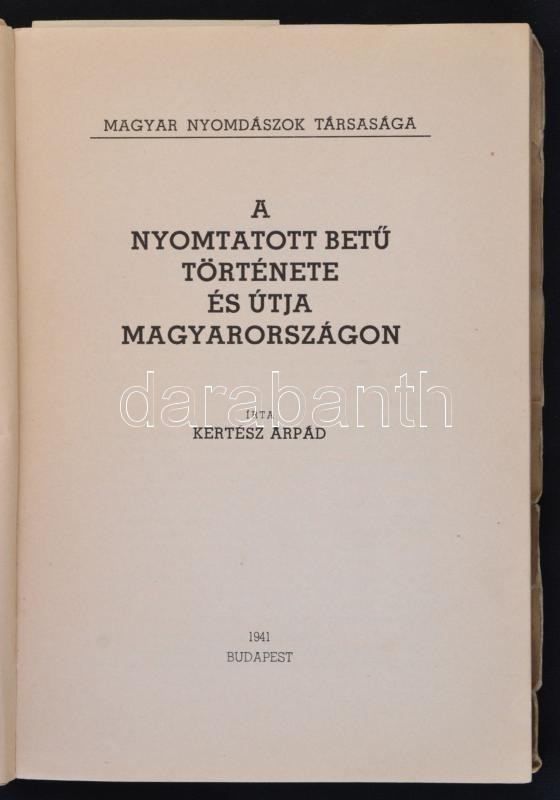 Kertész Árpád: A nyomtatott betű története és útja Magyarországon. Bp., 1941, Magyar Nyomdászok Társasága. Kiadói papírkötés, kissé szakadozott szélű borítóval, de egyébként jó állapotban.