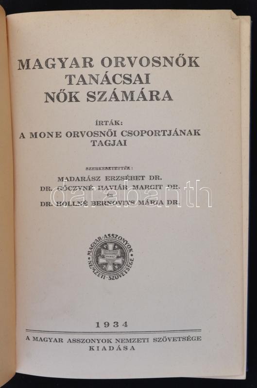 Magyar orvosnők tanácsai nők számára. A Magyar Asszonyok 6. Könyve. Szerk.: Madarász Erzsébet-Gőczyné Havaiár Margit-Hollné Bernovits Mária. Bp., 1934, Magyar Asszonyok Nemzeti Szövetsége. Kiadói egészvászon kötés.
