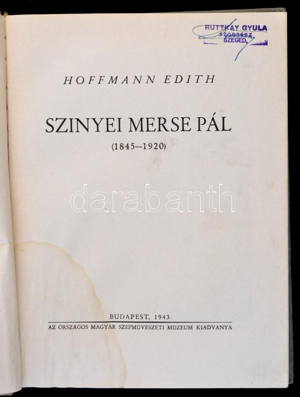 Hoffmann Edit: Szinyei Merse Pál (1845-1920). Budapest, 1943, Országos Magyar Szépművészeti Múzeum. Kiadói egészvászon kötés, foltos, fekete-fehér egészoldalas fotókkal illusztrálva, Ruttkay Gyula szegedi szobrász névbélyegzőjével.