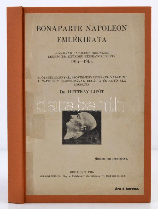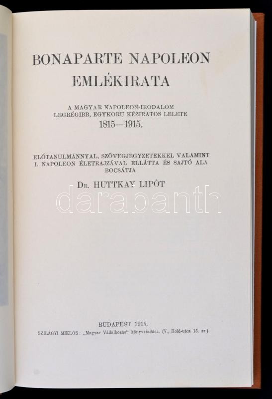 Bonaparte Napóleon Emlékirata. A magyar Napoleon-irodalom legrégibb, egykoru kéziratos lelete 1815-1915. Szerk.: Huttkay Lipót. Bp., 1915, Szilágyi Miklós, 238 p. Átkötött egészvászon kötés, de egyébként jó állapotban.