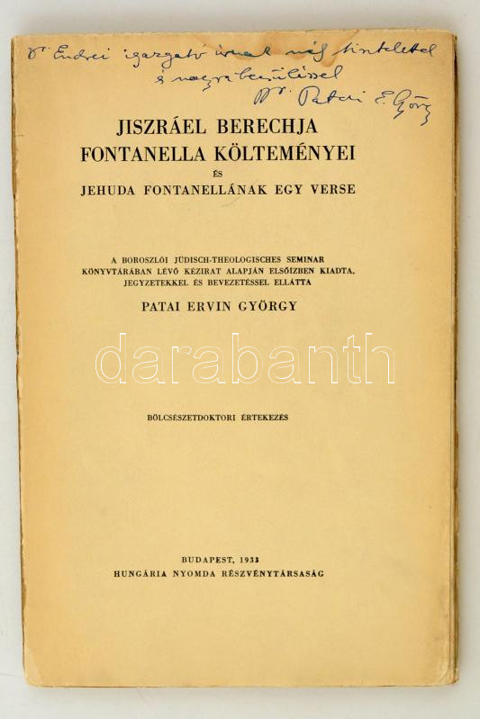 Patai Ervin György: Jiszráel Berechja Fontanella költeményei és Jehuda Fontanellának egy verse. Bölcsészdoktori értekezés. Bp., 1933, Hungária Nyomda Rt. A szerző által Endrei Henrik (1879-?), a pesti chevra kadisha igazgatója részére dedikálva. Ragasztott papírkötésben, borító nélkül, egyébként jó állapotban.