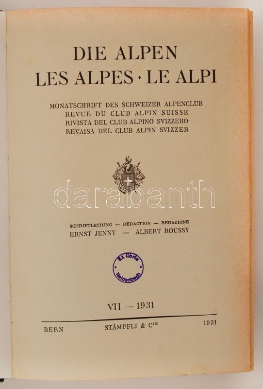1931 Die Alpen - Les Alpes - Le Alpi, a Svájci Alpesi Klub folyóiratának 7. évfolyama, hozzákötve: Chronik des S. A. C. und kleine Mitteilungen / Chronique du C. A. S. et reseignements divers (Bern, 1931). Vászonkötésben, jó állapotban.