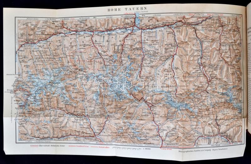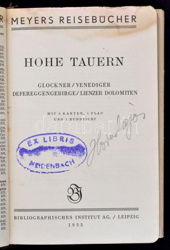 Hohe Tauern. Glockner/Venediger Defereggengebirge/Lienzer Dolomiten. Lipcse, 1933, Bibliographisches Institut AG. (Meyers Reisebücher). Térképmellékletekkel. Erősen kopott papírkötésben, ázásnyomos lapokkal.