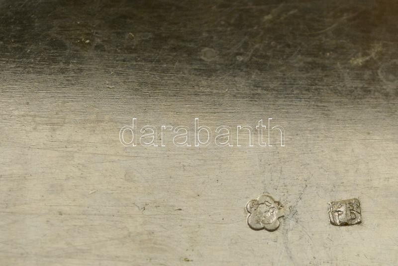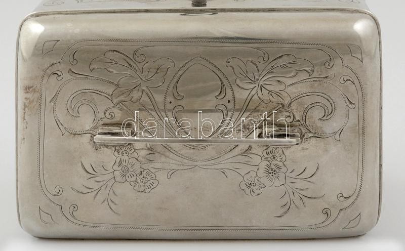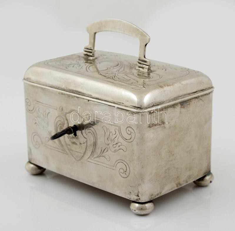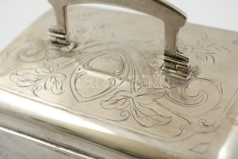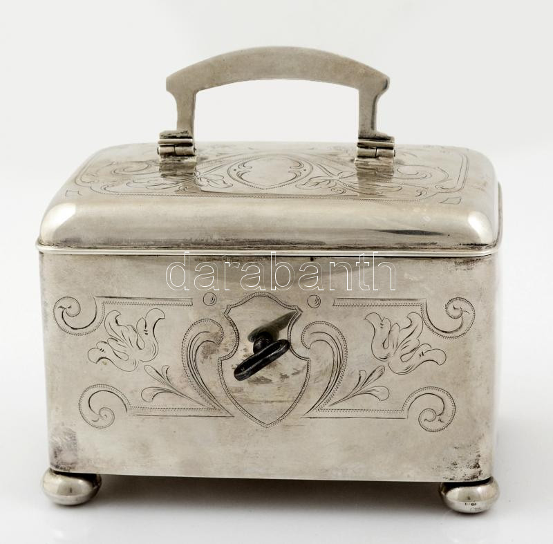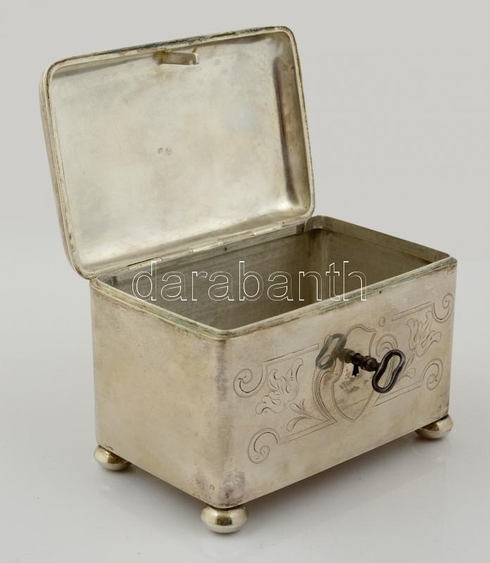 Ezüst (Ag.) cukortartó doboz, jelzett, mesterjeggyel (F.B.), gravírozott díszítéssel, kulccsal, jó állapotban, 13x8 cm, m: 12 cm, nettó: 441 g / silver sugar box, Ag, marked, net. 441 gr