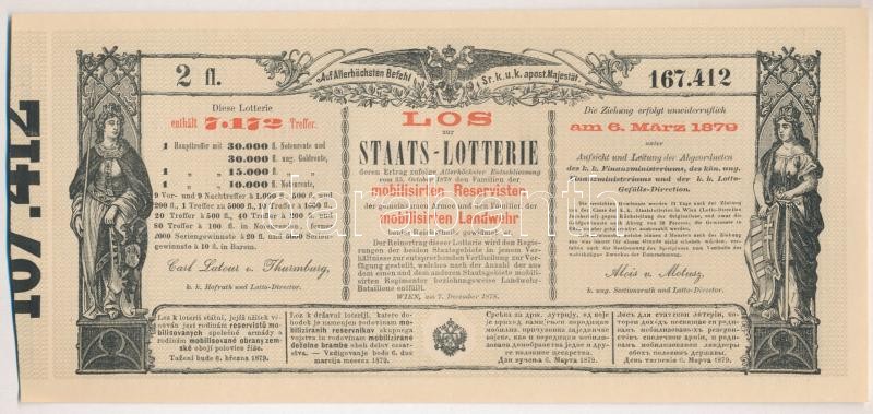Ausztria / Bécs 1878. "Sorsjegy állam-sorsjátékra a közös hadsereg mozgósított tartalékosai s az osztrák és magyar állam mozgósított honvédei családjai javára" T:I-,II Austria / Vienna 1878. "State Lottery Ticket for the Reservist of the Joint Army and the Families of the mobilized Honved's" C:AU,XF