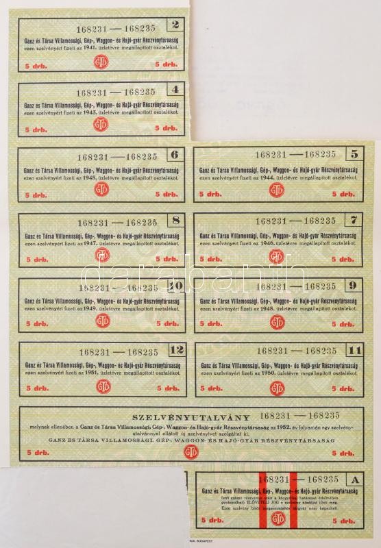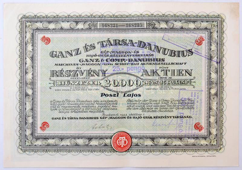 Budapest 1923. "Ganz és Társa-Danubius Gép-, Waggon- és Hajógyár Részvénytársaság" részvénye 20.000K-ról német és magyar nyelven szelvényekkel, felülbélyegzésekkel T:II