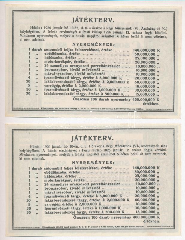 Budapest 1926. "Iparművészeti Sorsjegy az Országos Magyar Iparművészeti Társulat Jubileumi Kiállítása alkalmából" 5000K értékben (2x) "C" sorozat sorszámkövetők T:I,I-