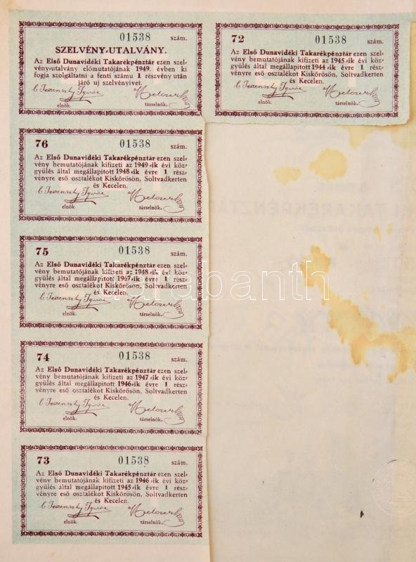 Kiskőrös 1930. "Első Dunavidéki Takarékpénztár" részvénye 50... https://www.darabanth.com/de/287-Fernauktion/287.0/Numismatik/Aktien-und-Tickets~300006/Kiskoros-1930-Elso-Dunavideki-Takarekpenztar-reszvenye-50P-rol-szelvenyekkel-szaraz~II1508642