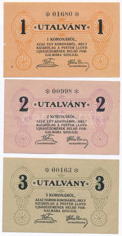 Budapest ~1920. 1K + 2K + 3K "Pester Lloyd" utalvány hátolda... https://www.darabanth.com/de/287-Fernauktion/287.0/Numismatik/Notgelden~300007/Budapest-7E1920-1K-plus-2K-plus-3K-Pester-Lloyd-utalvany-hatoldalon-belyegezve-TI-II--Hungary-Buda~II1503448