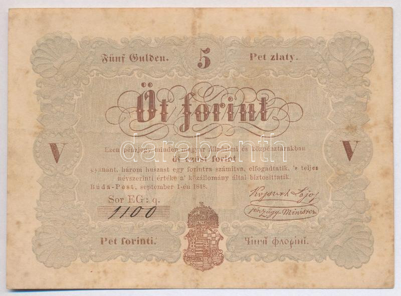 1848. 5Ft "Kossuth bankó" barna T:III https://www.darabanth.com/de/287-Fernauktion/287.0/Numismatik/Ungarische-Banknoten~500002/1848-5Ft-Kossuth-banko-barna-TIII~II1507478