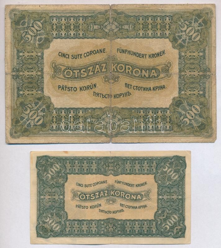 Beschreibung: 1920. 500K "Orell Füssli Zürich", alacsony sorozatszám + 1923. 500K "Magyar Pénzjegynyomda Rt. Budapest" T:III-,IV ly., szakadás