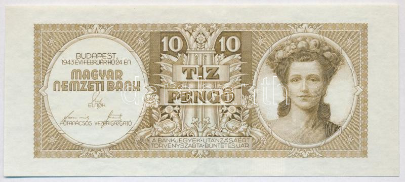 1943. 10P tervezet próbanyomata, utánnyomás, csak előlap T:II vágott https://www.darabanth.com/de/287-Fernauktion/287.0/Numismatik/Ungarische-Banknoten~500002/1943-10P-tervezet-probanyomata-utannyomas-csak-elolap-TII-vagott~II1508211