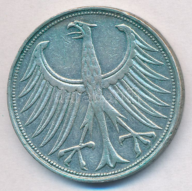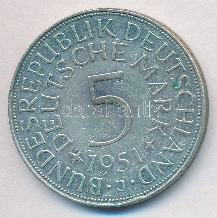 FRG 1951J 5 Mark Ag C:XF https://www.darabanth.com/de/287-Fernauktion/287.0/Numismatik/Weltweit-Munzen~300014/NSZK-1951J-5M-Ag-T2--FRG-1951J-5-Mark-Ag-CXF~II1506710