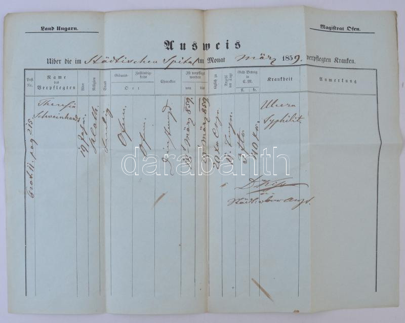1859 Buda, a városi kórház igazolása beteg részére https://www.darabanth.com/de/288-Fernauktion/288.0/Andere-Sammelgebiete/Dokument~16/1859-Buda-a-varosi-korhaz-igazolasa-beteg-reszere~II1518347