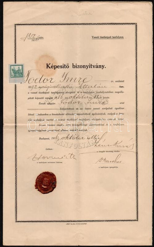 1916 Bp., Vasúti tisztképző tanfolyam elvégzéséről szóló bizonyítvány ... https://www.darabanth.com/de/288-Fernauktion/288.0/Andere-Sammelgebiete/Dokument~16/1916-Bp-Vasuti-tisztkepzo-tanfolyam-elvegzeserol-szolo-bizonyitvany-viaszpecsettel~II1513701