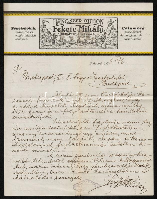 1926 Fekete Mihály Hangszerotthon díszes fejléces számla https://www.darabanth.com/de/288-Fernauktion/288.0/Andere-Sammelgebiete/Dokument~16/1926-Fekete-Mihaly-Hangszerotthon-diszes-fejleces-szamla~II1517975