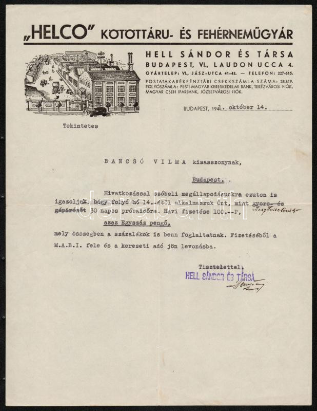 1941 Helco kötöttáru- és fehérneműgyár díszes fejléces számla https://www.darabanth.com/de/288-Fernauktion/288.0/Andere-Sammelgebiete/Dokument~16/1941-Helco-kotottaru-es-fehernemugyar-diszes-fejleces-szamla~II1517987