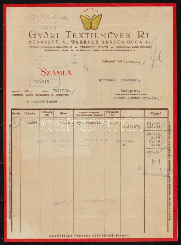 1946 Győri Textilművek Rt. díszes fejléces számla https://www.darabanth.com/de/288-Fernauktion/288.0/Andere-Sammelgebiete/Dokument~16/1946-Gyori-Textilmuvek-Rt-diszes-fejleces-szamla~II1517979