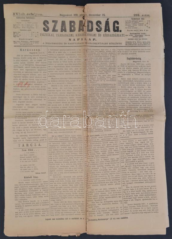 1891 Szabadság. Politikai, társadalmi, kereskedelmi és közgazdászati napilap, A biharmegyei és nagyváradi Szabadelvü-Párt közlönye. XVI. évfolyam, 298. szám, 1891. péntek december 25., megviselt, szakadozott állapotban.