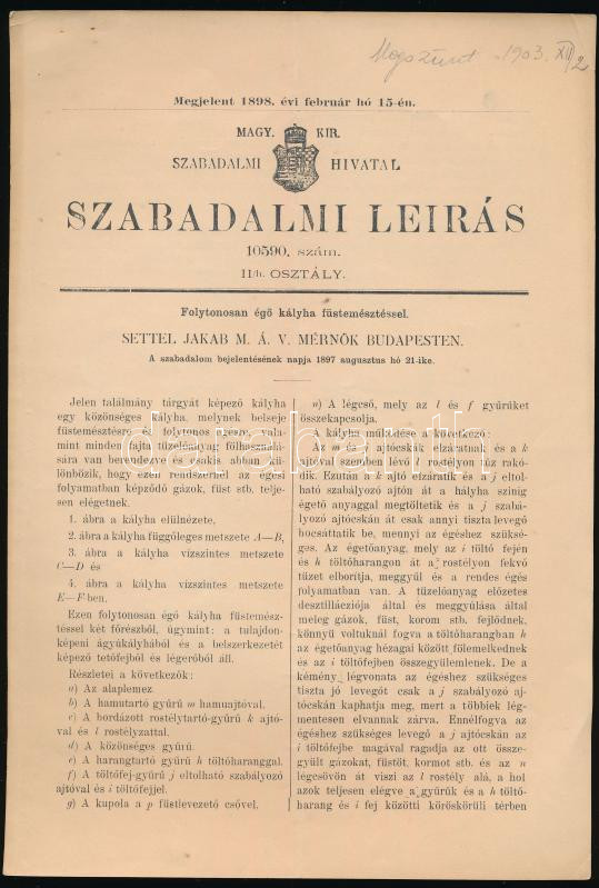 1898 Settel Jakab MÁV mérnök folytonosan égő kályhájának szabadalmi le... https://www.darabanth.com/de/288-Fernauktion/288.0/Andere-Sammelgebiete/Drucksachen~27/1898-Settel-Jakab-MAV-mernok-folytonosan-ego-kalyhajanak-szabadalmi-leirasa-M-KIr-Szaba~II1513920