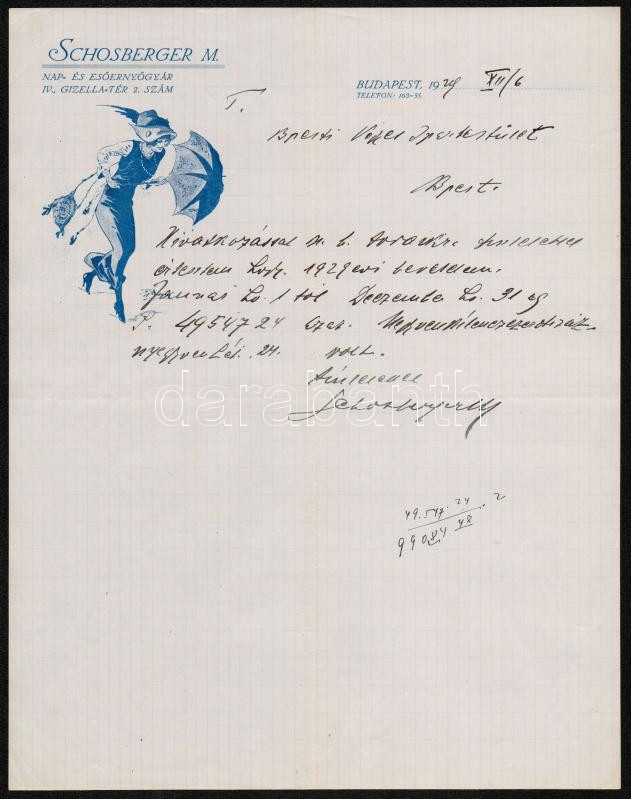 1922 Schosberger M. Nap-, és Esőernyőgyár, díszes fejléces levélpapír. https://www.darabanth.com/de/288-Fernauktion/288.0/Andere-Sammelgebiete/Drucksachen~27/1922-Schosberger-M-Nap--es-Esoernyogyar-diszes-fejleces-levelpapir~II1514316