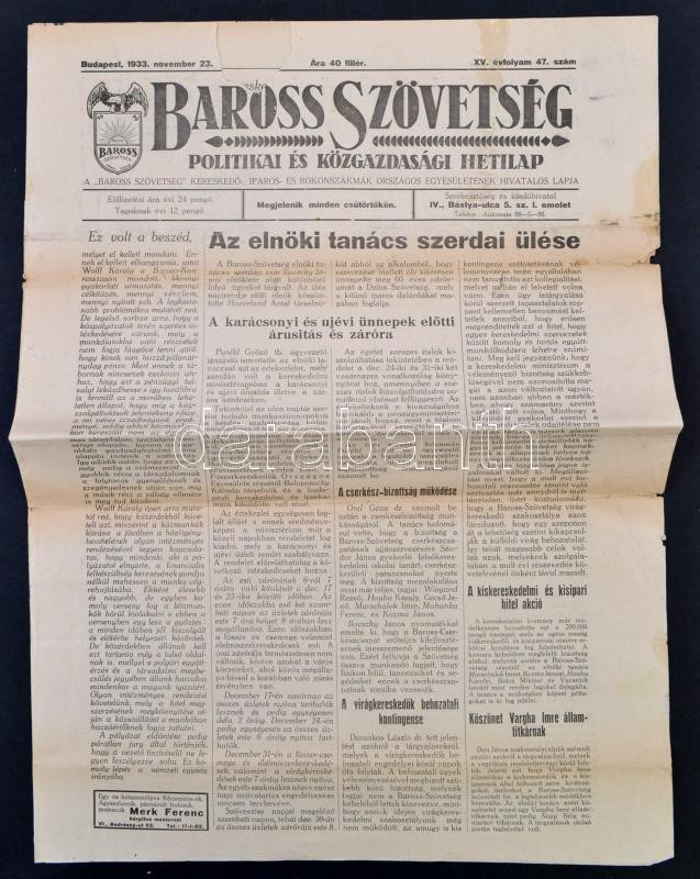 1933 Baross Szövetség. Politikai és Közgazdasági Hetilap, XV. évf. 47.... https://www.darabanth.com/de/288-Fernauktion/288.0/Andere-Sammelgebiete/Drucksachen~27/1933-Baross-Szovetseg-Politikai-es-Kozgazdasagi-Hetilap-XV-evf-47-szam-1933-nov-23-~II1514533
