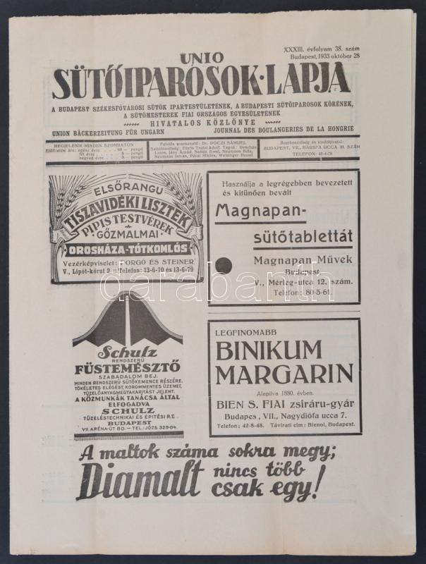 1933 Unio. Sütőiparosok Lapja, XXXIII. évf. 38. szám, 1933. október 28... https://www.darabanth.com/de/288-Fernauktion/288.0/Andere-Sammelgebiete/Drucksachen~27/1933-Unio-Sutoiparosok-Lapja-XXXIII-evf-38-szam-1933-oktober-28-10-p~II1514536