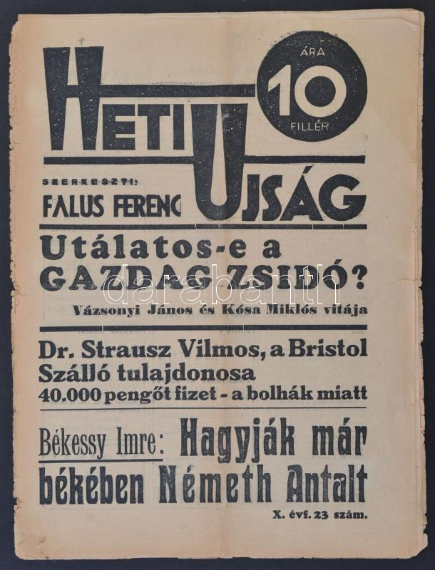 1935 Heti Ujság, X. évf. 23. szám, 1935. június. 9., Szerk.: Falus Fer... https://www.darabanth.com/de/288-Fernauktion/288.0/Andere-Sammelgebiete/Drucksachen~27/1935-Heti-Ujsag-X-evf-23-szam-1935-junius-9-Szerk-Falus-Ferenc-megviselt-szakadozot~II1514447