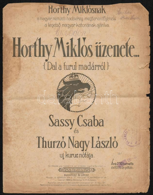 cca 1920 Horthy Miklós üzenete...(Dal a turul madárról) Sassy Csaba és Thurzó Nagy László kuruc nótájának kottája, erősen viseltes állapotban, teteje vágott. 34x26 cm