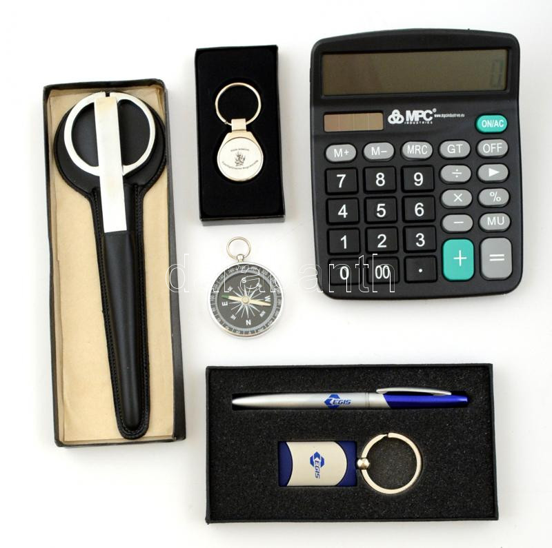 Beschreibung: Vegyes bolha tétel: levélbontó ollóval tokban, kulcstartó, toll kulcstartóval, iránytű, számológép, 5 db