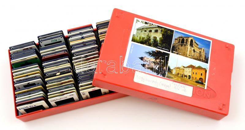 Beschreibung: cca 1975-1990 Magyar városképes diafilm-gyűjtemény (Tihany, Badacsony, Kőszeg, stb.), kb. 100 db, érdekes anyag, dobozba rendezve