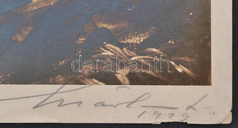 Beschreibung: 1929 Márton Ferenc (1884-1940) cserkészgrafikájáról készült korabeli reprodukció, Márton aláírásával, felületén törésnyomokkal, sarkán hiánnyal, 29,5x22 cm