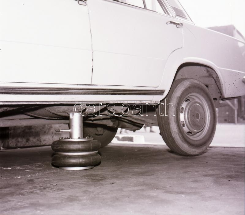 Beschreibung: 1971 Sűrített levegővel működő gépkocsi emelő bemutatásáról készült felvételsorozat, 12 db szabadon felhasználható vintage negatív, 6x6 cm