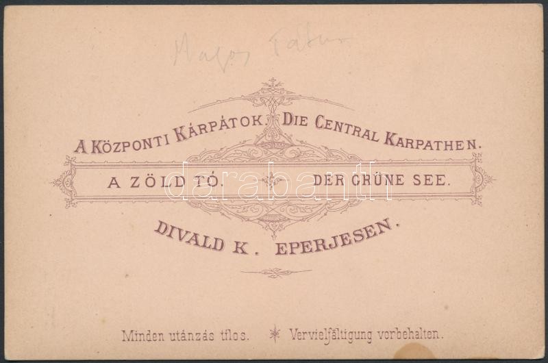 cca 1880-1890 Magas-Tátra: a Zöld-tó, keményhátú fotó Divald Károly mű... https://www.darabanth.com/de/288-Fernauktion/288.0/Andere-Sammelgebiete/Foto~19/cca-1880-1890-Magas-Tatra-a-Zold-to-kemenyhatu-foto-Divald-Karoly-mutermebol-hatulja~II1519001