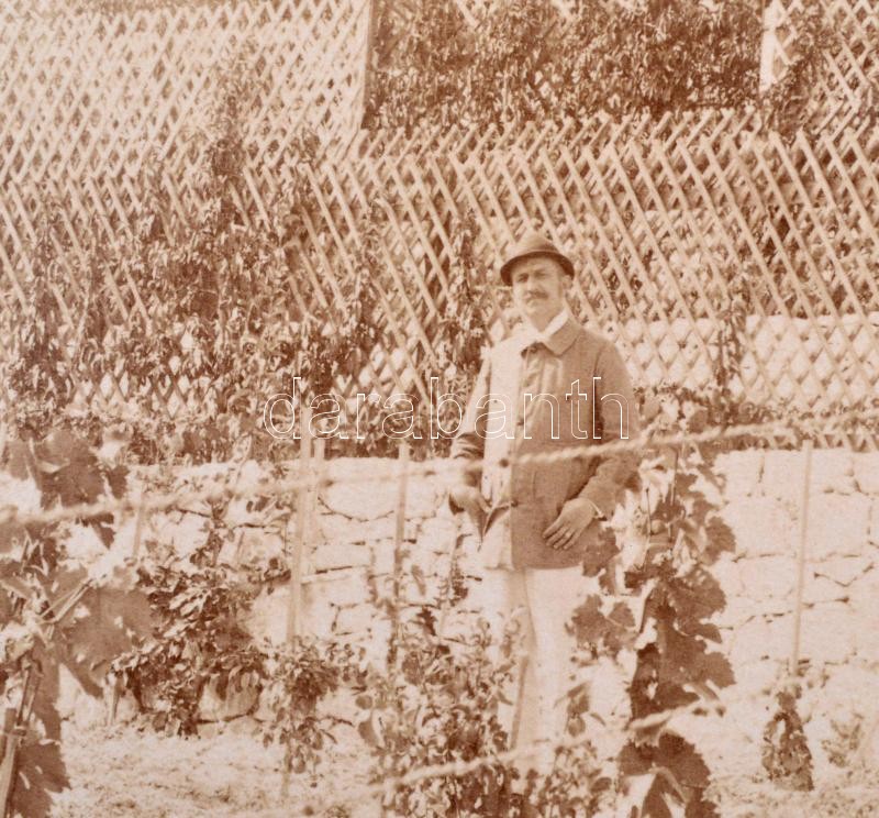 Beschreibung: cca 1900 Szőlősgazda a birtokán, fotó kartonra ragasztva, 20x25 cm