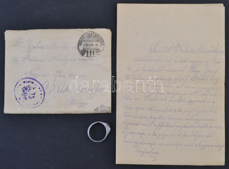 1916 Frontról hazaküldött levél katona kedvesének, benne egy gyűrűvel https://www.darabanth.com/de/288-Fernauktion/288.0/Andere-Sammelgebiete/Militaria~25/1916-Frontrol-hazakuldott-level-katona-kedvesenek-benne-egy-gyuruvel~II1516736