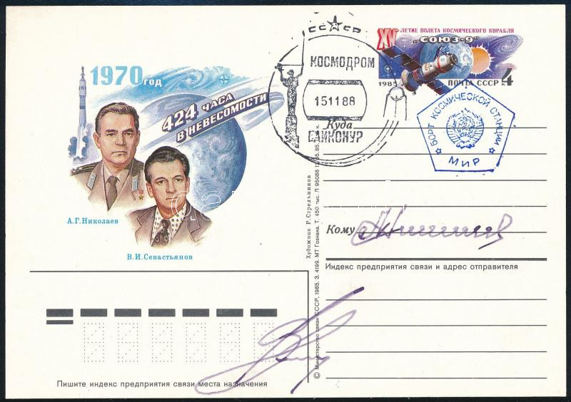 Adrijan Nyikolajev (1929-2004) és Vitalij Szevasztyjanov (1935-2010) szovjet űrhajósok aláírásai levelezőlapon /