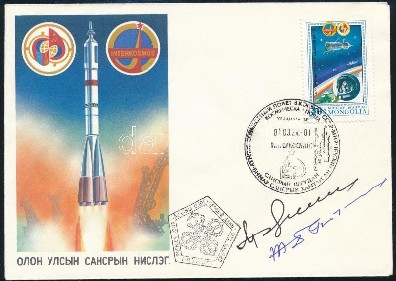 Signatures of Vladimir Dzhanibekov (1942- ) Soviet and Jügderdemidiin Gurragchaa Mongolian astronauts on envelope
