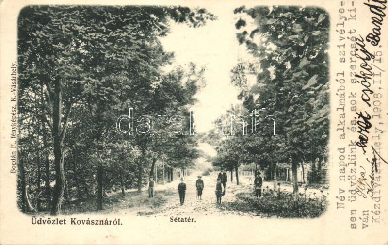 Kovászna, Covasna; Sétatér, Bogdán F. fényképész / promenade https://www.darabanth.com/de/288-Fernauktion/288.0/Ansichtskarten/Siebenburgen~200006/Kovaszna-Covasna-Setater-Bogdan-F-fenykepesz-promenade~II1516238