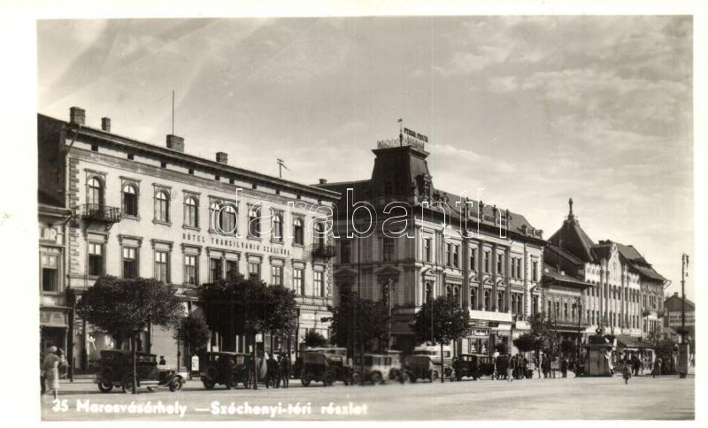 Marosvásárhely, Targu Mures; Széchényi tér, Hotel Transilvania szálloda, Hotel New York, 'Box' Garázs, Benzin és Olaj, Kalap Király, Bresslauer üzlete, cukrászda, étterem, automobilok / square, hotel, 'Box' garage, shops, confectionery, restaurant, automobiles